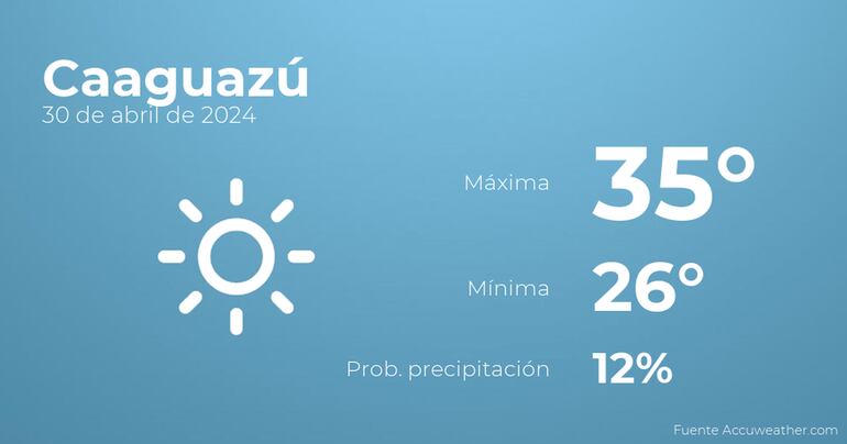 Para hoy por la mañana en Caaguazú tendremos cielos despejados con baja probabilidad de que haya precipitaciones. Según pasen las horas habrá cielos sin nubes. Por lo que respecta a las temperaturas, estas se moverán entre los 35 grados de máxima y 26 de mínima. En general, vientos del norte de carácter débil con cifras de hasta 46 Km/h.