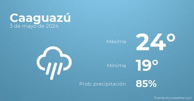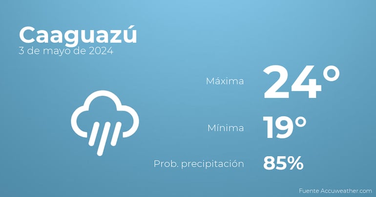 Durante la mañana en Caaguazú el cielo estará cubierto con alguna llovizna. Según pasen las horas habrá cielos cubiertos con tormentas y lluvia. En cuanto a las temperaturas, estarán entre los 24 grados de máxima y 19 de mínima. Además, se esperan vientos de carácter flojo con cifras de hasta 33 Km/h.
