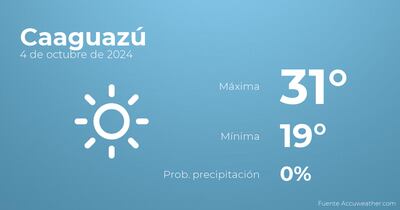 Hoy a primera hora en Caaguazú habrá cielos sin nubes. Por la tarde se prevén cielos despejados. Con respecto a las temperaturas, estas se moverán entre los 31 grados de máxima y 19 de mínima. En general, vientos de carácter débil con valores de hasta 24 kilómetros por hora.