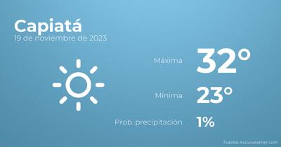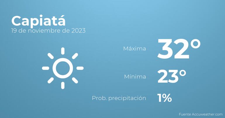 Para las primeras horas del día en Capiatá habrá cielos despejados. A medida que avance el día se esperan nubes y claros. En relación a las temperaturas, estas se moverán entre una máxima de 32 y una mínima de 23 grados. Además, se esperan vientos del sureste sin apenas intensidad con rachas de hasta 33 kilómetros por hora.