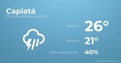 Durante la mañana en Capiatá el cielo estará cubierto con probabilidad de tormentas acompañadas de lluvia. Según pasen las horas tendremos más nubes que claros con escasa probabilidad de precipitaciones. En relación a las temperaturas, estas variarán entre los 26 grados de máxima y 21 de mínima. En general, vientos del este de carácter débil con valores de hasta 32 Km/h.