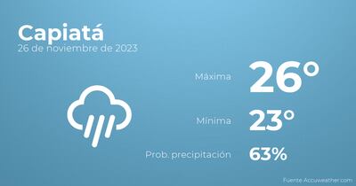 A lo largo de la mañana en Capiatá se prevén cielos cubiertos con probabilidad de lloviznas generalizadas e intermitentes. Por la tarde tendremos cielos cubiertos con tormentas y lluvia. Con respecto a las temperaturas, estas se moverán entre los 26 grados de máxima y 23 de mínima. Viento de carácter flojo con rachas de hasta 30 Km/h.