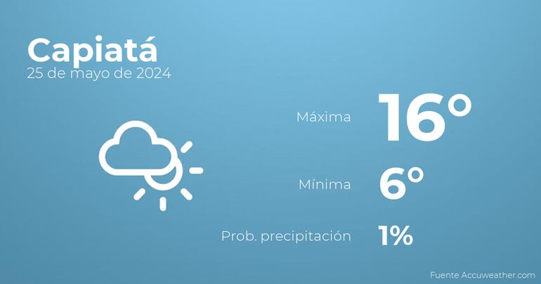 Para hoy por la mañana en Capiatá tendremos más nubes que claros. A medida que avance el día habrá nubes y claros. Las temperaturas estarán entre los 16 grados de máxima y 6 de mínima. Viento del sur de carácter débil con cifras de hasta 33 Km/h.
