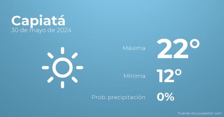 En las primeras horas del día en Capiatá tendremos cielos sin nubes. Por la tarde se prevén cielos sin nubes. En relación a las temperaturas, estas se moverán entre los 22 grados de máxima y 12 de mínima. Junto a todo esto, se esperan vientos del este de poca intensidad con rachas de hasta 20 Km/h.