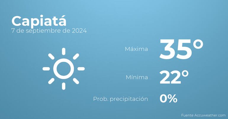 Para las primeras horas del día en Capiatá se esperan cielos sin nubes. A medida que avance el día habrá cielos sin nubes. Por lo que respecta a las temperaturas, estas variarán entre los 35 grados de máxima y 22 de mínima. En general, vientos de carácter flojo con valores de hasta 30 Km/h.