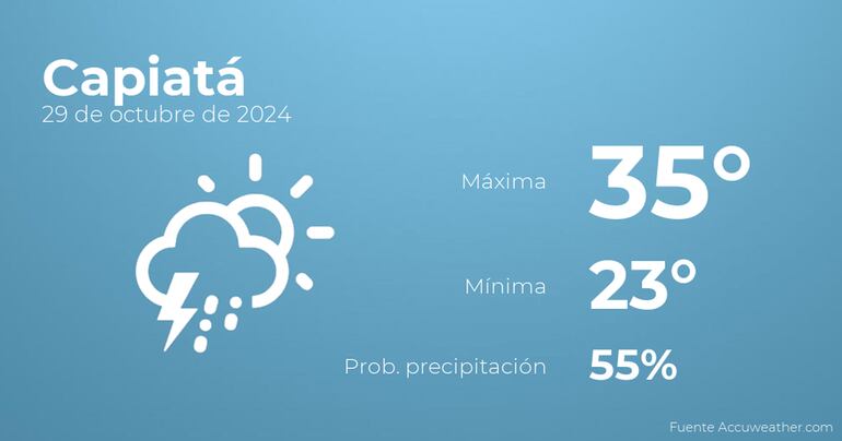 Durante las primeras horas del día en Capiatá se esperan nubes y claros con probabilidad de tormentas acompañadas de lluvia. Por la tarde tendremos cielos sin nubes. En relación a las temperaturas, estas variarán entre una máxima de 35 y una mínima de 23 grados. En general, vientos del este de carácter débil con rachas de hasta 26 kilómetros por hora.