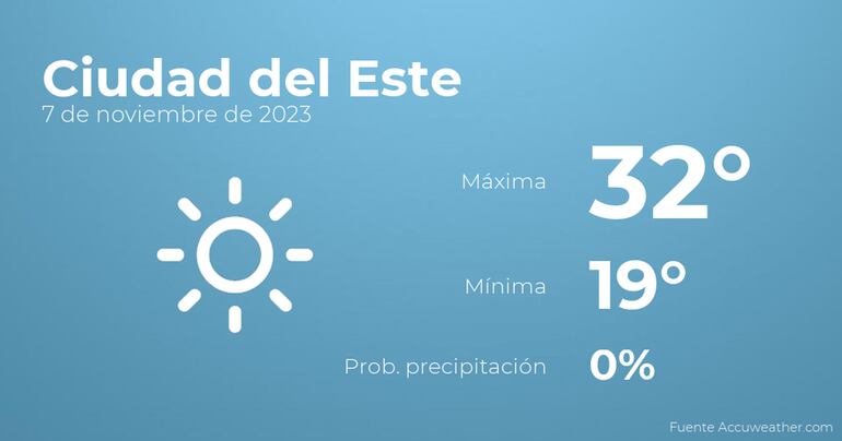 Hoy a primera hora en Ciudad del Este tendremos cielos sin nubes. Por la tarde se esperan nubes escasas. En cuanto a las temperaturas, oscilarán entre una máxima de 32 y una mínima de 19 grados. Viento del noreste de carácter débil con rachas de hasta 37 kilómetros por hora.