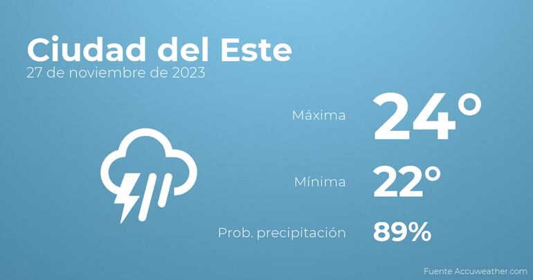 Para el día de hoy en Ciudad del Este se esperan cielos cubiertos con tormentas acompañadas de lluvia. En relación a las temperaturas, estas oscilarán entre una máxima de 24 y una mínima de 22 grados centígrados. Junto a todo esto, se esperan vientos del noreste sin apenas intensidad con rachas de hasta 33 kilómetros por hora.