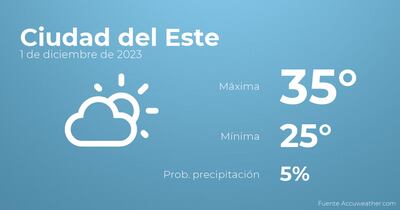 En el día de hoy en Ciudad del Este tendremos escasa nubosidad. Con respecto a las temperaturas, variarán entre una máxima de 35 y una mínima de 25 grados centígrados. Junto a todo esto, se esperan vientos de carácter débil con cifras de hasta 32 Km/h.