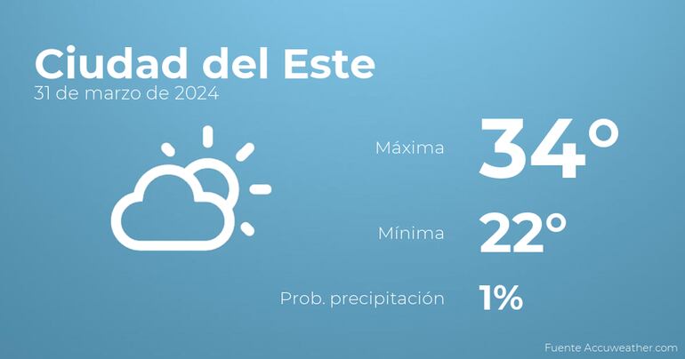 Hoy por la mañana en Ciudad del Este habrá nubes y claros. Según pasen las horas tendremos nubes y claros con escasa probabilidad de precipitaciones. Con respecto a las temperaturas, variarán entre una máxima de 34 y una mínima de 22 grados. Viento sin apenas intensidad con valores de hasta 22 kilómetros por hora.