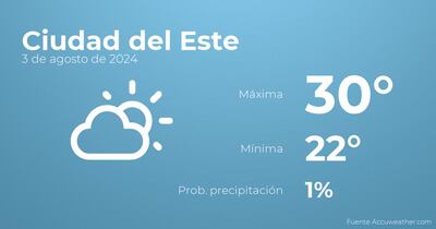 Hoy a primera hora en Ciudad del Este se espera escasa nubosidad. Por la tarde tendremos más nubes que claros. En relación a las temperaturas, estas oscilarán entre los 30 grados de máxima y 22 de mínima. En general, vientos del noreste de poca intensidad con rachas de hasta 50 Km/h.