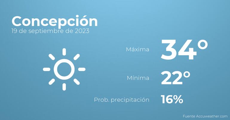 A lo largo del día de hoy en Concepción tendremos cielos despejados con escasa probabilidad de precipitaciones. Con respecto a las temperaturas, variarán entre una máxima de 34 y una mínima de 22 grados. Junto a todo esto, se esperan vientos de carácter flojo con rachas de hasta 20 Km/h.