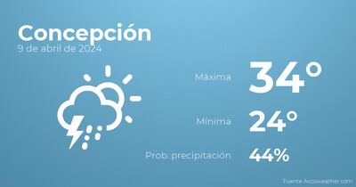 Para las primeras horas del día en Concepción se esperan nubes y claros con probabilidad de tormentas y lluvia. Según pasen las horas tendremos nubes y claros con escasa probabilidad de precipitaciones. Por lo que respecta a las temperaturas, estas se moverán entre los 34 grados de máxima y 24 de mínima. Además, se esperan vientos del este de carácter débil con cifras de hasta 20 kilómetros por hora.