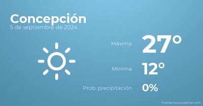 En las primeras horas del día en Concepción tendremos cielos despejados. Por la tarde se esperan cielos despejados. Las temperaturas estarán entre una máxima de 27 y una mínima de 12 grados centígrados. Junto a todo esto, se esperan vientos de poca intensidad con rachas de hasta 41 Km/h.