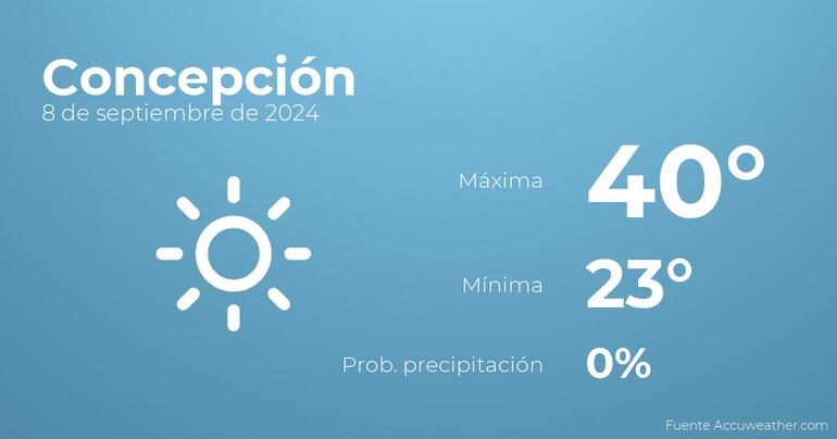 Durante la mañana en Concepción se prevén cielos sin nubes. Por la tarde tendremos nubes y claros. Por lo que respecta a las temperaturas, estas variarán entre los 40 grados de máxima y 23 de mínima. En general, vientos de poca intensidad con valores de hasta 30 kilómetros por hora.