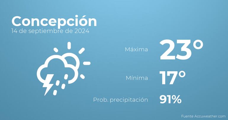 En las primeras horas del día en Concepción se esperan más nubes que claros con tormentas acompañadas de lluvia. Por la tarde se prevén más nubes que claros con poca probabilidad de lluvias. Las temperaturas se moverán entre una máxima de 23 y una mínima de 17 grados centígrados. Además, se esperan vientos del sur de carácter débil con valores de hasta 41 Km/h.