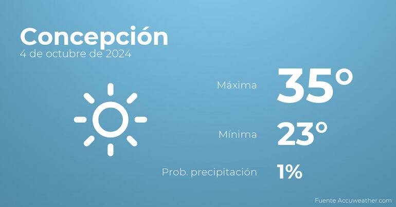 Hoy en Concepción habrá cielos sin nubes. Con respecto a las temperaturas, oscilarán entre una máxima de 35 y una mínima de 23 grados centígrados. En general, vientos sin apenas intensidad con rachas de hasta 26 kilómetros por hora.