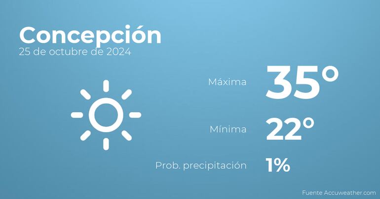 Hoy a primera hora en Concepción se esperan cielos despejados. Según pasen las horas tendremos más nubes que claros. En cuanto a las temperaturas, estas se moverán entre una máxima de 35 y una mínima de 22 grados centígrados. En general, vientos del norte de poca intensidad con valores de hasta 26 kilómetros por hora.