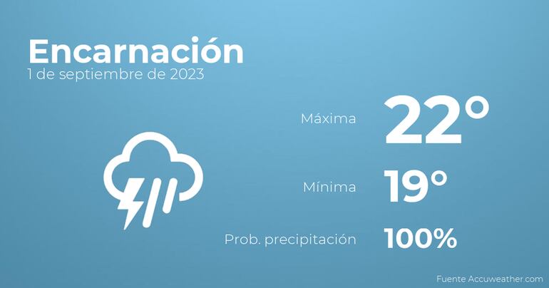 En las primeras horas del día en Encarnación el cielo estará cubierto con tormentas acompañadas de lluvia. Según pasen las horas se prevén cielos cubiertos con lloviznas generalizadas e intermitentes. Las temperaturas se moverán entre una máxima de 22 y una mínima de 19 grados centígrados. En general, vientos de carácter flojo con valores de hasta 46 Km/h.