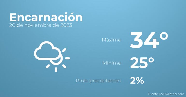 A lo largo de la mañana en Encarnación habrá más nubes que claros. Según pasen las horas tendremos nubes y claros. Las temperaturas oscilarán entre una máxima de 34 y una mínima de 25 grados. En general, vientos del noreste de carácter débil con cifras de hasta 37 Km/h.