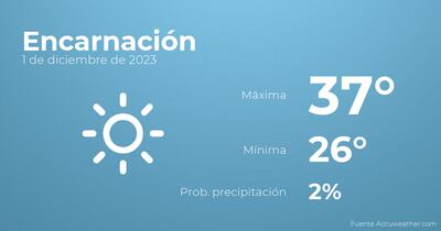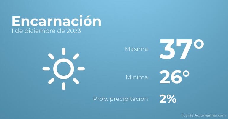 En la mañana de hoy en Encarnación se esperan cielos despejados. Según pasen las horas se prevén nubes y claros. Con respecto a las temperaturas, estas se moverán entre los 37 grados de máxima y 26 de mínima. Junto a todo esto, se esperan vientos de poca intensidad con valores de hasta 35 Km/h.