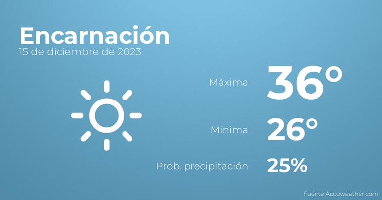 En las primeras horas del día en Encarnación tendremos cielos sin nubes con poca probabilidad de precipitaciones. Por la tarde habrá nubes y claros. En relación a las temperaturas, estas variarán entre una máxima de 36 y una mínima de 26 grados. Viento de carácter flojo con rachas de hasta 33 kilómetros por hora.