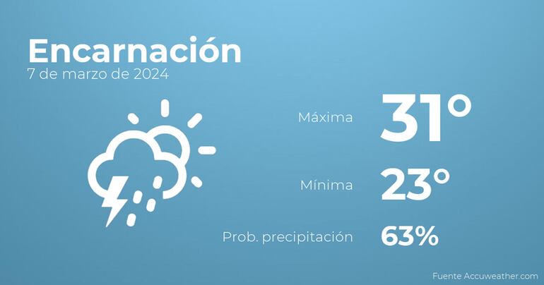Hoy a primera hora en Encarnación tendremos más nubes que claros con probabilidad de tormentas y lluvia. Según pasen las horas se esperan más nubes que claros con poca probabilidad de precipitaciones. Con respecto a las temperaturas, oscilarán entre una máxima de 31 y una mínima de 23 grados centígrados. En general, vientos de carácter flojo con valores de hasta 26 kilómetros por hora.