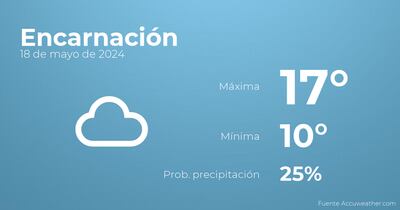 Para las primeras horas del día en Encarnación estará muy nublado con poca probabilidad de precipitaciones. A medida que avance el día tendremos nubes y claros. Por lo que respecta a las temperaturas, estas oscilarán entre los 17 grados de máxima y 10 de mínima. Junto a todo esto, se esperan vientos del sur de carácter débil con rachas de hasta 30 Km/h.