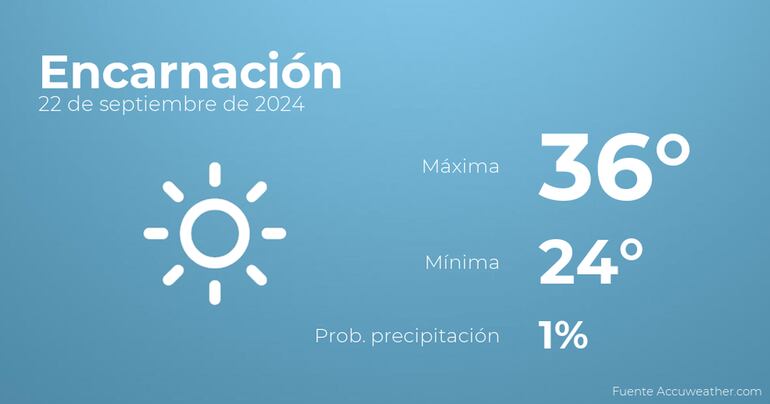 En la mañana de hoy en Encarnación habrá cielos sin nubes. Según pasen las horas se esperan cielos sin nubes. Con respecto a las temperaturas, estas se moverán entre una máxima de 36 y una mínima de 24 grados centígrados. En general, vientos del norte sin apenas intensidad con cifras de hasta 32 Km/h.