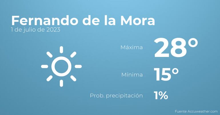 Durante las primeras horas del día en Fernando de la Mora se esperan cielos sin nubes. Según pasen las horas se prevén cielos sin nubes. Por lo que respecta a las temperaturas, estas variarán entre una máxima de 28 y una mínima de 15 grados centígrados. En general, vientos del noreste de carácter débil con cifras de hasta 20 kilómetros por hora.