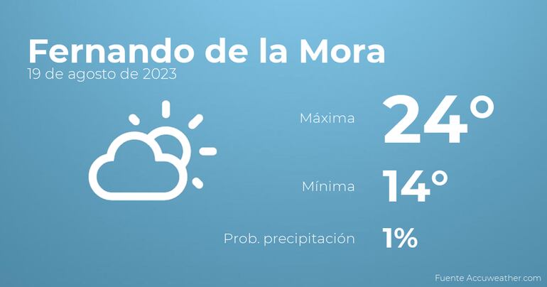 En el día de hoy en Fernando de la Mora tendremos pocas nubes. En cuanto a las temperaturas, estas oscilarán entre los 24 grados de máxima y 14 de mínima. Además, se esperan vientos sin apenas intensidad con cifras de hasta 30 kilómetros por hora.