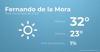 En la mañana de hoy en Fernando de la Mora se prevén cielos sin nubes. Por la tarde tendremos nubes y claros. Por lo que respecta a las temperaturas, estas variarán entre los 32 grados de máxima y 23 de mínima. En general, vientos del sureste de carácter flojo con valores de hasta 33 Km/h.