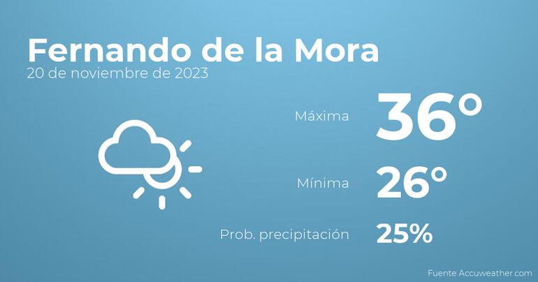 Hoy a primera hora en Fernando de la Mora tendremos más nubes que claros con baja probabilidad de que haya precipitaciones. Por la tarde se esperan nubes y claros. Con respecto a las temperaturas, estas se moverán entre una máxima de 36 y una mínima de 26 grados centígrados. Junto a todo esto, se esperan vientos de carácter débil con rachas de hasta 43 Km/h.