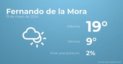 Durante las primeras horas del día en Fernando de la Mora habrá más nubes que claros. Según pasen las horas tendremos pocas nubes. En relación a las temperaturas, estas oscilarán entre una máxima de 19 y una mínima de 9 grados. Además, se esperan vientos del sur sin apenas intensidad con rachas de hasta 30 Km/h.