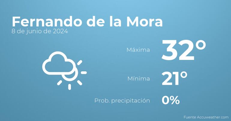 Durante la mañana en Fernando de la Mora tendremos más nubes que claros. Por la tarde se esperan nubes y claros. Con respecto a las temperaturas, estas se moverán entre los 32 grados de máxima y 21 de mínima. Además, se esperan vientos del noreste sin apenas intensidad con rachas de hasta 35 Km/h.
