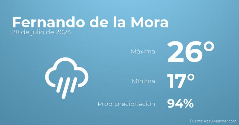Hoy a primera hora en Fernando de la Mora el cielo estará cubierto con lloviznas generalizadas e intermitentes. A medida que avance el día se esperan cielos cubiertos con probabilidad de alguna llovizna. Por lo que respecta a las temperaturas, estas variarán entre una máxima de 26 y una mínima de 17 grados. Viento del noroeste de carácter flojo con rachas de hasta 30 Km/h.
