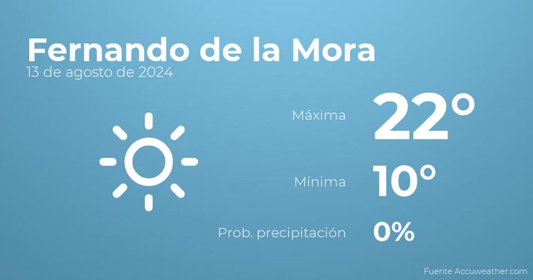 A lo largo de la mañana en Fernando de la Mora habrá cielos sin nubes. A medida que avance el día se esperan cielos despejados. Las temperaturas estarán entre una máxima de 22 y una mínima de 10 grados. En general, vientos del este de carácter flojo con valores de hasta 24 Km/h.