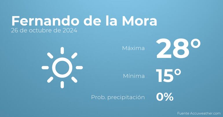 Para las primeras horas del día en Fernando de la Mora se prevén cielos sin nubes. Por la tarde habrá nubes escasas. Con respecto a las temperaturas, estas oscilarán entre los 28 grados de máxima y 15 de mínima. Además, se esperan vientos del sur de poca intensidad con valores de hasta 35 Km/h.
