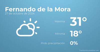 Hoy por la mañana en Fernando de la Mora habrá nubes escasas. Según pasen las horas se espera escasa nubosidad. Por lo que respecta a las temperaturas, estas variarán entre una máxima de 31 y una mínima de 18 grados. Junto a todo esto, se esperan vientos del sureste de poca intensidad con valores de hasta 22 kilómetros por hora.