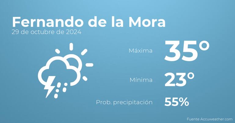 Durante las primeras horas del día en Fernando de la Mora tendremos nubes y claros con probabilidad de tormentas acompañadas de lluvia. Según pasen las horas se esperan cielos despejados. En cuanto a las temperaturas, oscilarán entre una máxima de 35 y una mínima de 23 grados centígrados. Viento del este de carácter flojo con cifras de hasta 26 kilómetros por hora.