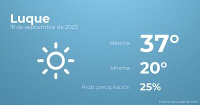 A lo largo de la mañana en Luque tendremos cielos despejados con poca probabilidad de lluvias. Por la tarde se prevén nubes y claros con poca probabilidad de precipitaciones. Por lo que respecta a las temperaturas, estas oscilarán entre los 37 grados de máxima y 20 de mínima. Además, se esperan vientos del noroeste de carácter flojo con valores de hasta 44 Km/h.