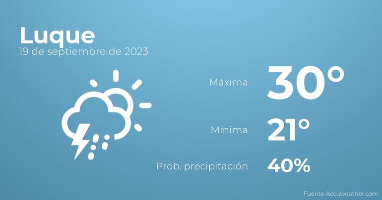 Para hoy por la mañana en Luque habrá nubes y claros con probabilidad de tormentas y lluvia. Por la tarde tendremos cielos cubiertos con tormentas acompañadas de lluvia. Por lo que respecta a las temperaturas, estas se moverán entre una máxima de 30 y una mínima de 21 grados. Además, se esperan vientos del suroeste de carácter flojo con cifras de hasta 24 kilómetros por hora.