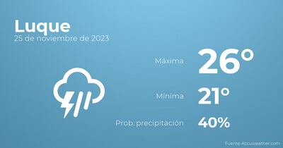 Hoy por la mañana en Luque habrá cielos cubiertos con probabilidad de tormentas acompañadas de lluvia. Por la tarde se esperan más nubes que claros con baja probabilidad de que haya precipitaciones. En relación a las temperaturas, estas variarán entre una máxima de 26 y una mínima de 21 grados. Además, se esperan vientos del este de poca intensidad con valores de hasta 32 kilómetros por hora.