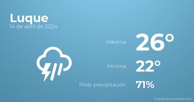 Durante las primeras horas del día en Luque el cielo estará cubierto con probabilidad de tormentas y lluvia. Según pasen las horas el cielo estará cubierto con lloviznas generalizadas e intermitentes. Por lo que respecta a las temperaturas, estas se moverán entre los 26 grados de máxima y 22 de mínima. Junto a todo esto, se esperan vientos del noreste sin apenas intensidad con valores de hasta 33 Km/h.