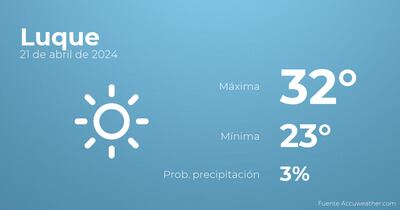 Durante las primeras horas del día en Luque se esperan cielos despejados. Por la tarde habrá pocas nubes con poca probabilidad de precipitaciones. Con respecto a las temperaturas, estas se moverán entre una máxima de 32 y una mínima de 23 grados centígrados. Viento sin apenas intensidad con valores de hasta 30 Km/h.