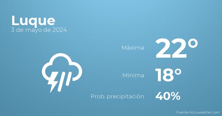 En las primeras horas del día en Luque el cielo estará cubierto con probabilidad de tormentas acompañadas de lluvia. Por la tarde se esperan cielos cubiertos con probabilidad de lloviznas generalizadas e intermitentes. En cuanto a las temperaturas, estarán entre los 22 grados de máxima y 18 de mínima. Viento del suroeste de carácter débil con rachas de hasta 26 Km/h.
