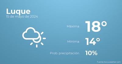 En la mañana de hoy en Luque se prevén más nubes que claros. Por la tarde habrá cielos nubosos con poca probabilidad de lluvias. Las temperaturas estarán entre una máxima de 18 y una mínima de 14 grados centígrados. Viento de carácter flojo con valores de hasta 18 Km/h.