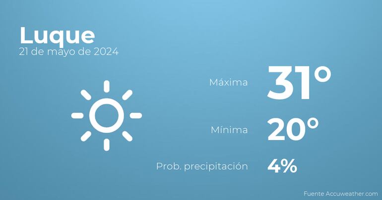 Para hoy en Luque se esperan cielos sin nubes. En cuanto a las temperaturas, estarán entre los 31 grados de máxima y 20 de mínima. Viento del noreste sin apenas intensidad con valores de hasta 33 Km/h.