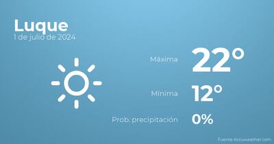 Hoy por la mañana en Luque tendremos cielos despejados. Por la tarde se prevén cielos sin nubes. Con respecto a las temperaturas, estas oscilarán entre los 22 grados de máxima y 12 de mínima. Junto a todo esto, se esperan vientos de carácter débil con cifras de hasta 18 kilómetros por hora.