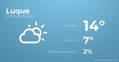 Para las primeras horas del día en Luque se prevé escasa nubosidad. Según pasen las horas habrá más nubes que claros con escasa probabilidad de precipitaciones. Las temperaturas estarán entre una máxima de 14 y una mínima de 7 grados centígrados. Viento de carácter débil con rachas de hasta 33 kilómetros por hora.
